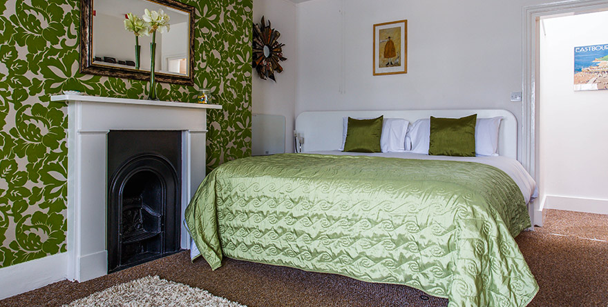Suite 6 on our top floor (lots of stairs!) is our largest ensuite option with kitchen. The main bed can be set up as super-kingsize or twins, plus there’s a double sofabed and space for a camp bed or cot.